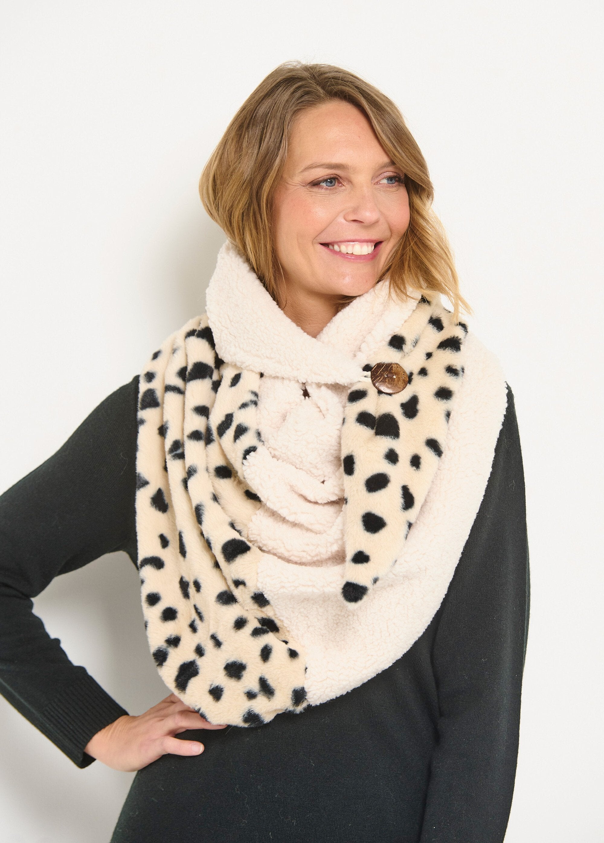 ¡Esta funda de hombro es una pieza elegante y cálida, que combina un suave vellón con piel sintética de dálmata para lograr un efecto realmente "wow"! El reverso está confeccionado en tejido polar a juego, aportando un toque extra de suavidad. Se cierra con un bonito botón de madera. Perfecta para calentar tus atuendos con estilo, esta funda de hombro es ideal para las frescas noches de otoño o como un accesorio elegante para ocasiones especiales.
