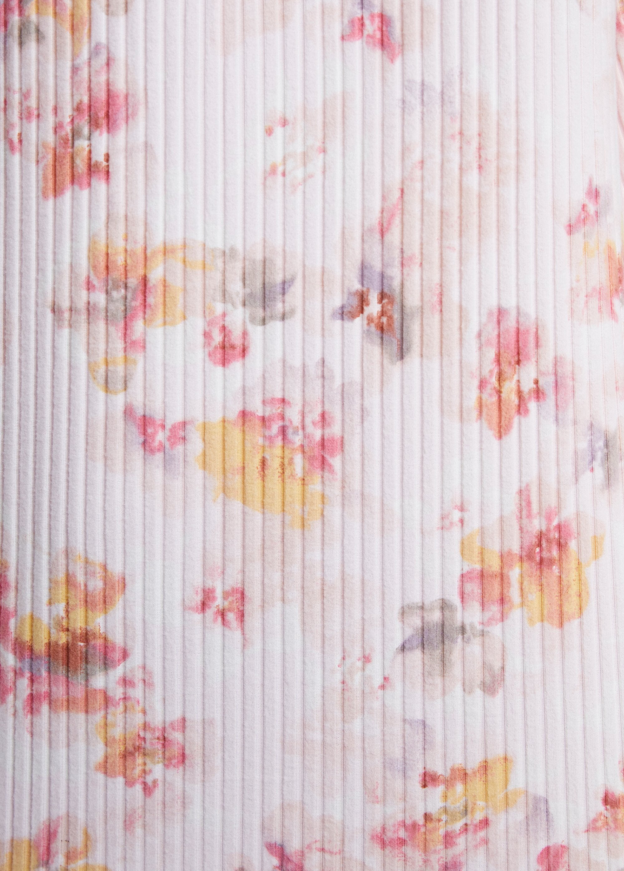 El tejido veraniego por excelencia, el punto acanalado elástico, realza la comodidad de esta bata estampada con cuello kimono. Estilo cruzado con cinturón liso y lazo interior. Canesú liso en el bajo de las mangas 3/4 y la vista. Bajo recto con dobladillo. Tacto suave.