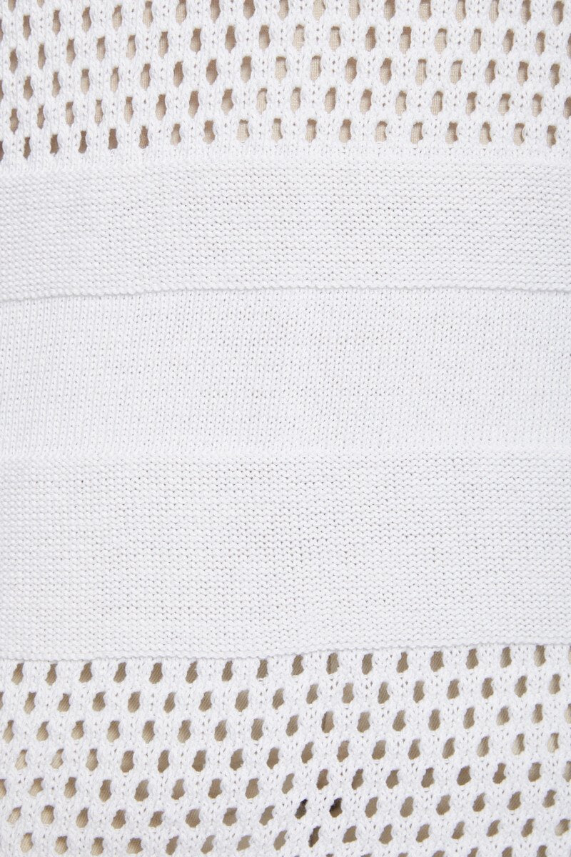Fresco y femenino, este suéter túnica combina punto calado con puntadas de fantasía en el revés y el derecho para un hermoso efecto de relieve. Puños acanalados en el cuello redondo. Puños acanalados en el bajo y la parte inferior de las mangas largas.