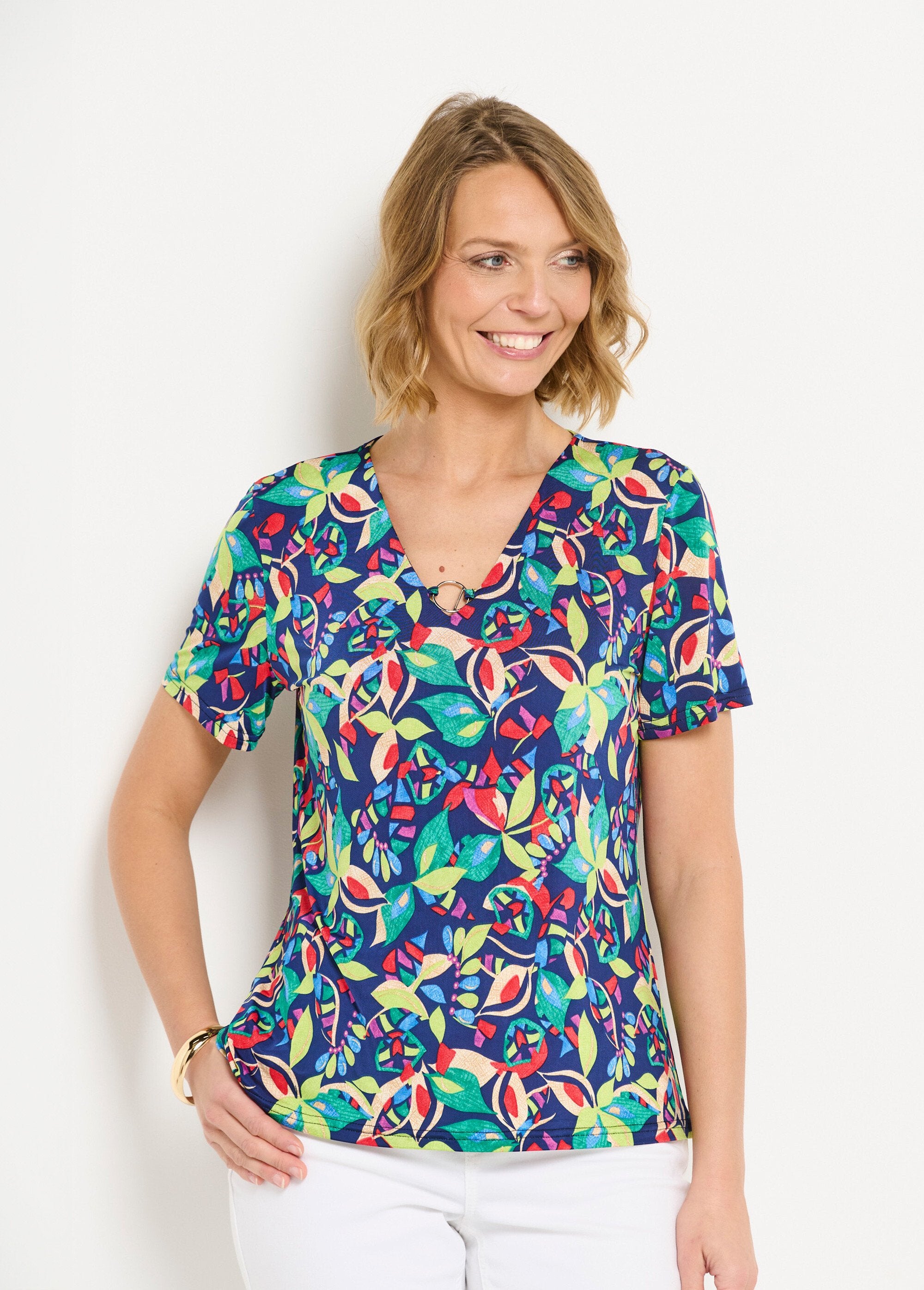 La camiseta lisa o estampada, confeccionada en punto suave y elástico. Cuello interior en la parte delantera, escote en V, caída con dije de fantasía. Bies al bies en escote trasero. Mangas cortas. Base recta. Fabricación francesa.