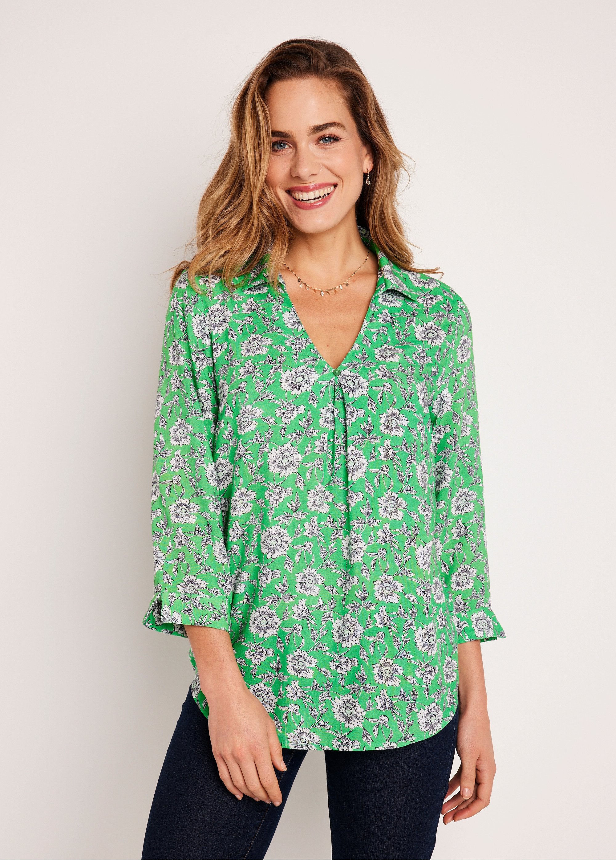 Adecuada tanto para tallas pequeñas como grandes, la túnica desempeña la doble función de comodidad y estilo. Y cuida su corte: cuello en punta en V con botón de fantasía, pliegue bajo el escote para darle volumen, canesú en la parte inferior de las mangas 3/4 y bajo ligeramente redondeado.